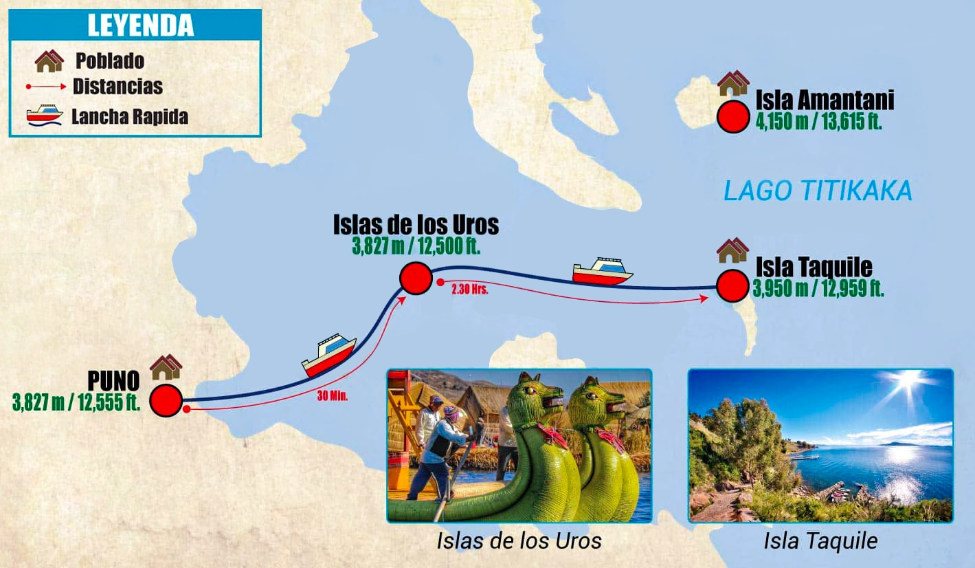 06:45 am Traslado del Hotel al muelle de Puno. 07am. Salida del muelle para la excursión lacustre a las Islas Flotantes de los Uros existe una duración de 25 minutos en lancha turistica. Los Ureños viven en casas rurales construidas sobre plataformas de juncos, que no exceden de 30 a 40 cm de grosor, donde podremos encontrar y conocer la cultura y tradición que se llega a dar en los Uros, ya que en cada Isla se encuentra un alrededor de 5 a 6 familias. 10:30 am Continuaremos hacia la Isla Taquile en el viaje por lancha podrá apreciar la belleza natural del lago Sagrado de los Incas donde sus pobladores se caracterizan por conservar su cultuta de creencias costumbristas y tradicionales, manifestandolas a traves de su vestimenta, ritos, religión, etc. 12:30pm. Arribamos a la Isla de Taquile luego Ud. podrá ver el traje típico del poblador Taquileño y las casas rurales, arcos prehispánicos y las 550 escalones. 14:00 pm. Retorno a Puno. 17:00 pm. Fin del tour , transporte hacia los hoteles, plaza de armas.